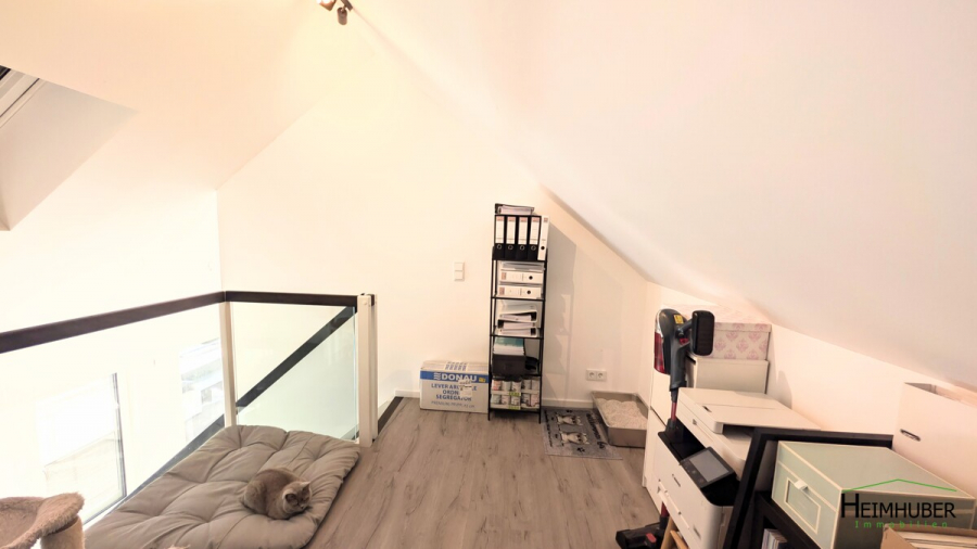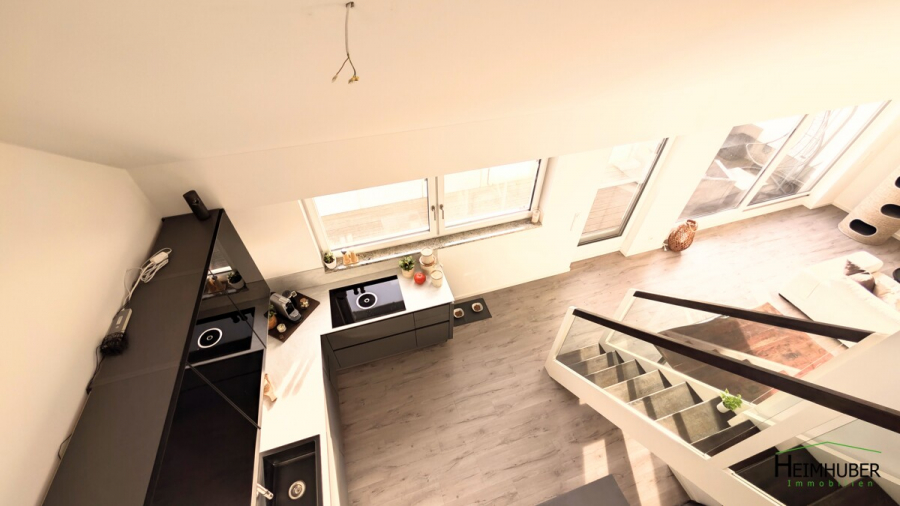 Die Wohnung erreicht man bequem mit dem Aufzug, welcher auch bis in die Tiefgarage reicht. Sie bietet den ganzen Tag tolles Licht in allen Räumen. Durch die hohen ( 5,30 Meter) und abgeschrägten Decken sowie der großen Fensterfront im Wohnbereich und der Galerie wirkt sie wie ein modernes Loft. Der Wohnbereich samt Küche verteilet sich auf ca. 33 m². Über die Treppe erreicht man die ca. 7 m² große Galerie. Sie unterstreicht nochmals den Loft-Charakter der Wohnung und ist ideal für ein Homeoffice. Ein weiteres Highlight ist der ca. 19 m² große Südbalkon, welchen man über eine große Schiebetür aus dem Wohnzimmer erreicht. Der Balkon bietet genug Platz z.B. für einen Loungebereich, einem Grillplatz sowie Grünpflanzen. Oder er dient Ihnen als Sonnenterasse im Winter.