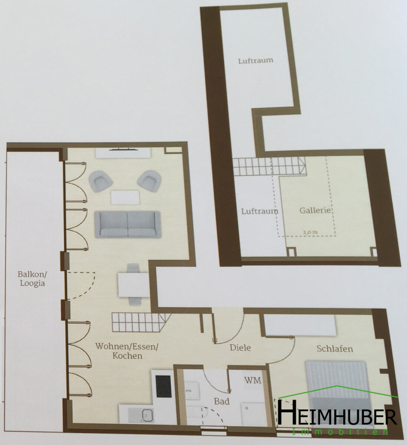 Die Wohnung erreicht man bequem mit dem Aufzug, welcher auch bis in die Tiefgarage reicht. Sie bietet den ganzen Tag tolles Licht in allen Räumen. Durch die hohen ( 5,30 Meter) und abgeschrägten Decken sowie der großen Fensterfront im Wohnbereich und der Galerie wirkt sie wie ein modernes Loft. Der Wohnbereich samt Küche verteilet sich auf ca. 33 m². Über die Treppe erreicht man die ca. 7 m² große Galerie. Sie unterstreicht nochmals den Loft-Charakter der Wohnung und ist ideal für ein Homeoffice. Ein weiteres Highlight ist der ca. 19 m² große Südbalkon, welchen man über eine große Schiebetür aus dem Wohnzimmer erreicht. Der Balkon bietet genug Platz z.B. für einen Loungebereich, einem Grillplatz sowie Grünpflanzen. Oder er dient Ihnen als Sonnenterasse im Winter.