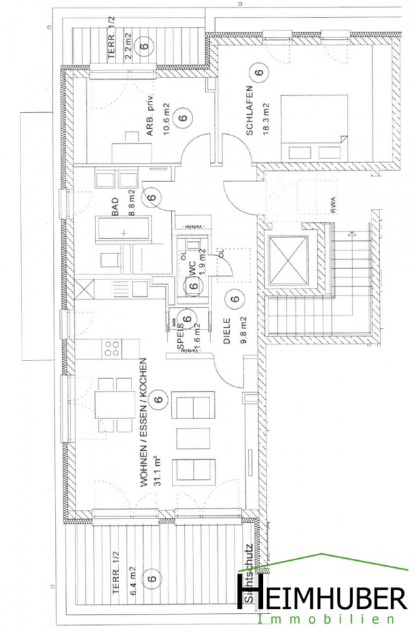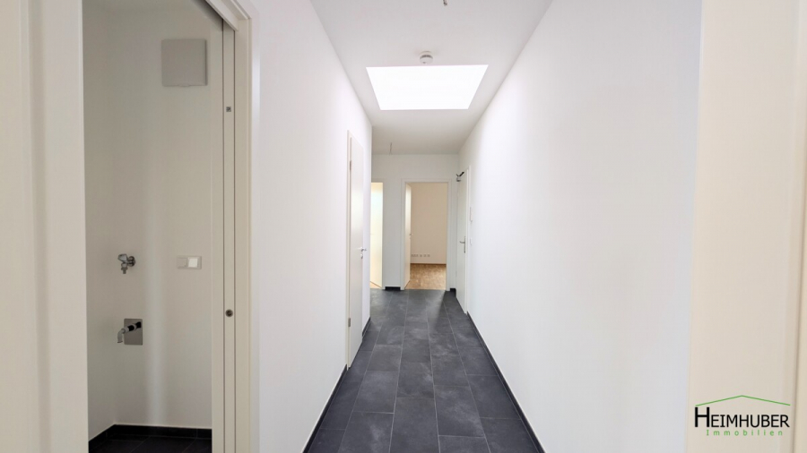 Die ca. 9,8 m² große Diele mit Garderobe heißt Ihre Gäste willkommen. Von dort aus gelangt man in das ca. 31 m² große Wohnzimmer mit Platz für eine Küche. Eine Kammer ist von der Küche und vom Flur aus zu erreichen und bietet zudem Anschlüsse für eine Waschmaschine und einen Trockner. Vom Wohnzimmer aus gelangt man zudem auf die ca. 13 m² große West-Terrasse.